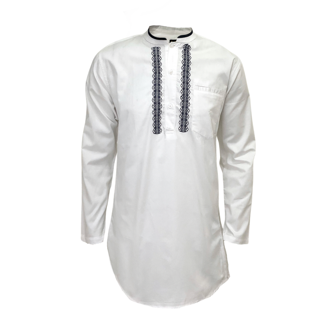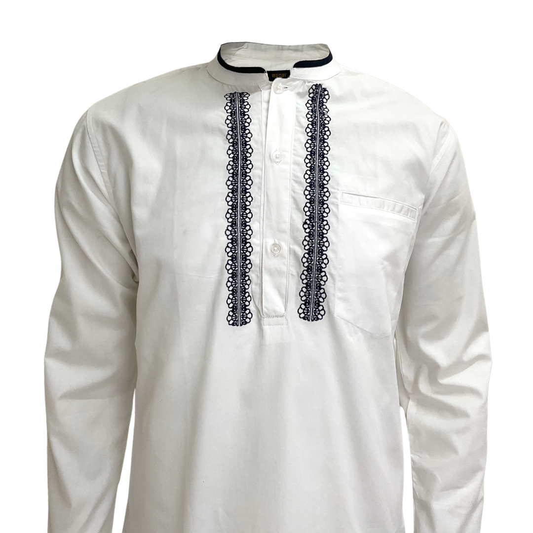 Koko Kurta Pria Lengan Panjang – White Navy Embroidery Edition